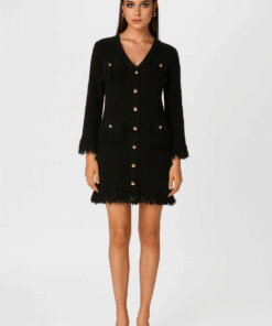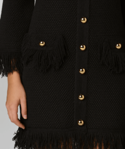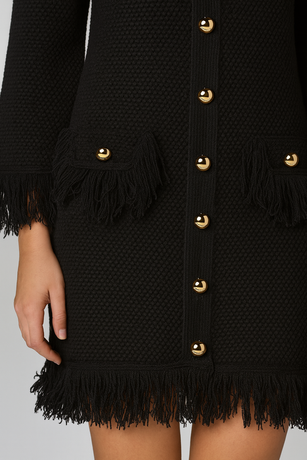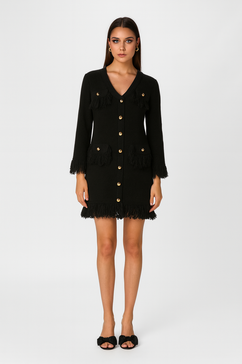 ABITO IN MAGLIA CON DETTAGLI SFRANGIATI, IL MODELLO A TRAPEZIO PERMETTE UNA MAGGIORE VESTIBILITA’ ANCHE SU FISICITA’ PIU’ FORMOSE, EVITANDO SI SEGNARE SULL’ADDOME