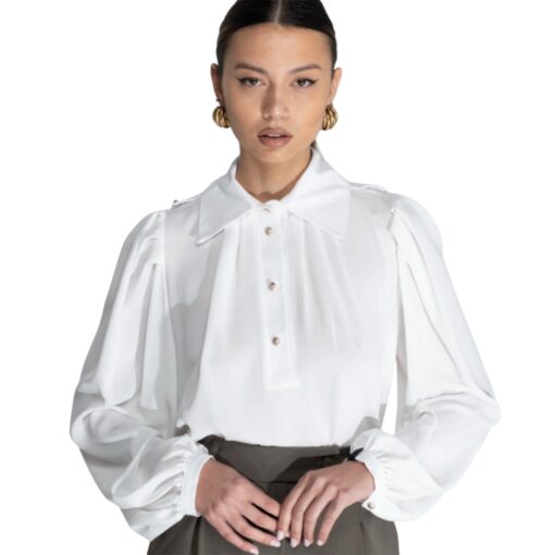 BLUSA MODELLO CAMICIA , VESTIBILITA’ COMODA , MANICA AMPIA CON POLSINO E BOTTONE IN FONDO ALLA MANICA