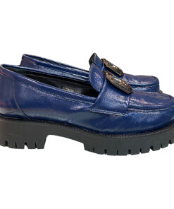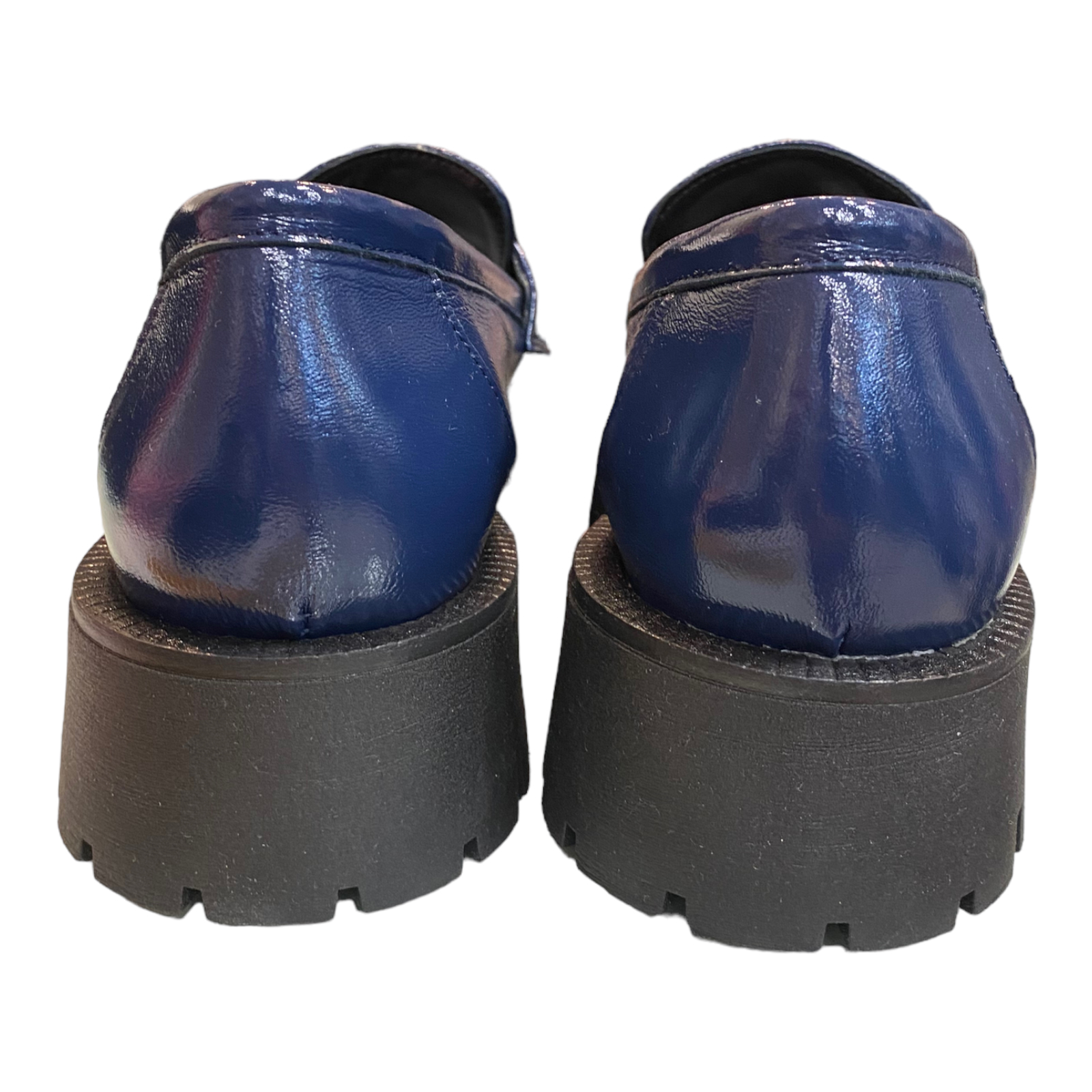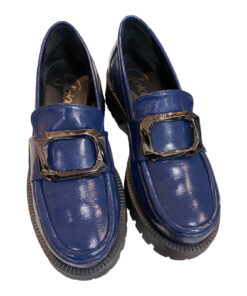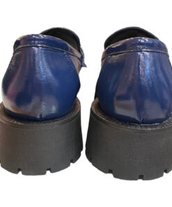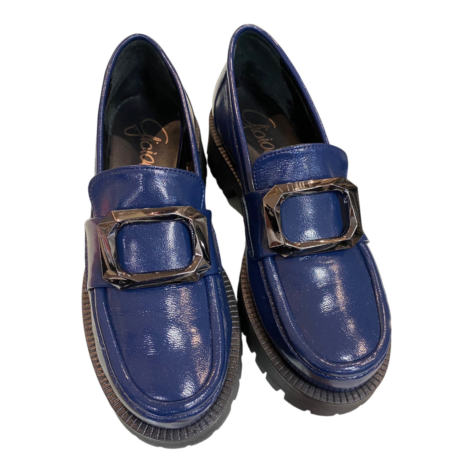 Mocassino blu in morbida vernice con accessorio, fondo carroarmato, calzata comoda non adatto a chi ha un piede magro