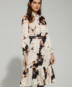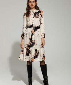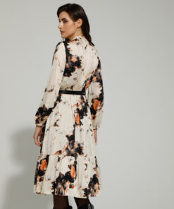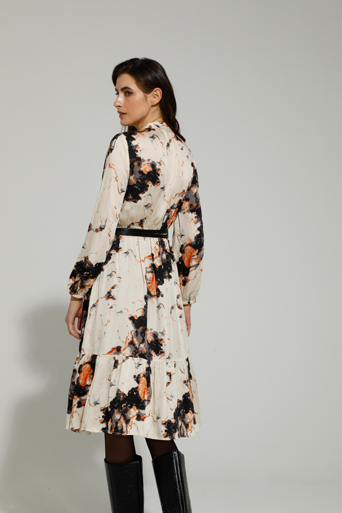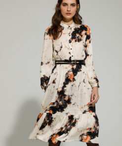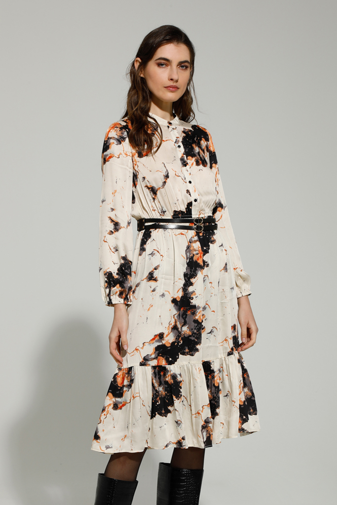Abito lungo con colletto alla coreana apribile con bottoncini sulla parte frontale. Realizzato in satin di viscosa stampa marble. Manica lunga a palloncino con finitura elastica. Gonna con balza arricciata al fondo.