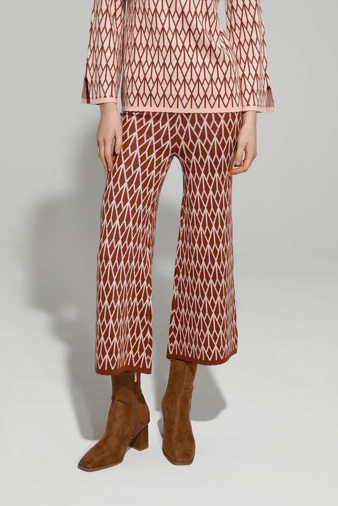 Pantalone Jappo in jacquard disegno geometrico bicolor. Vita elastica lavorata a costina in contrasto. Linea svasata al fondo