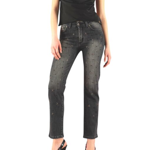 JEANS GAMBA DRITTA IN COTONE ELASTICIZZATO, LA PARTE ANTERIORE è ARRICHITA DA PERLINE E STRASS