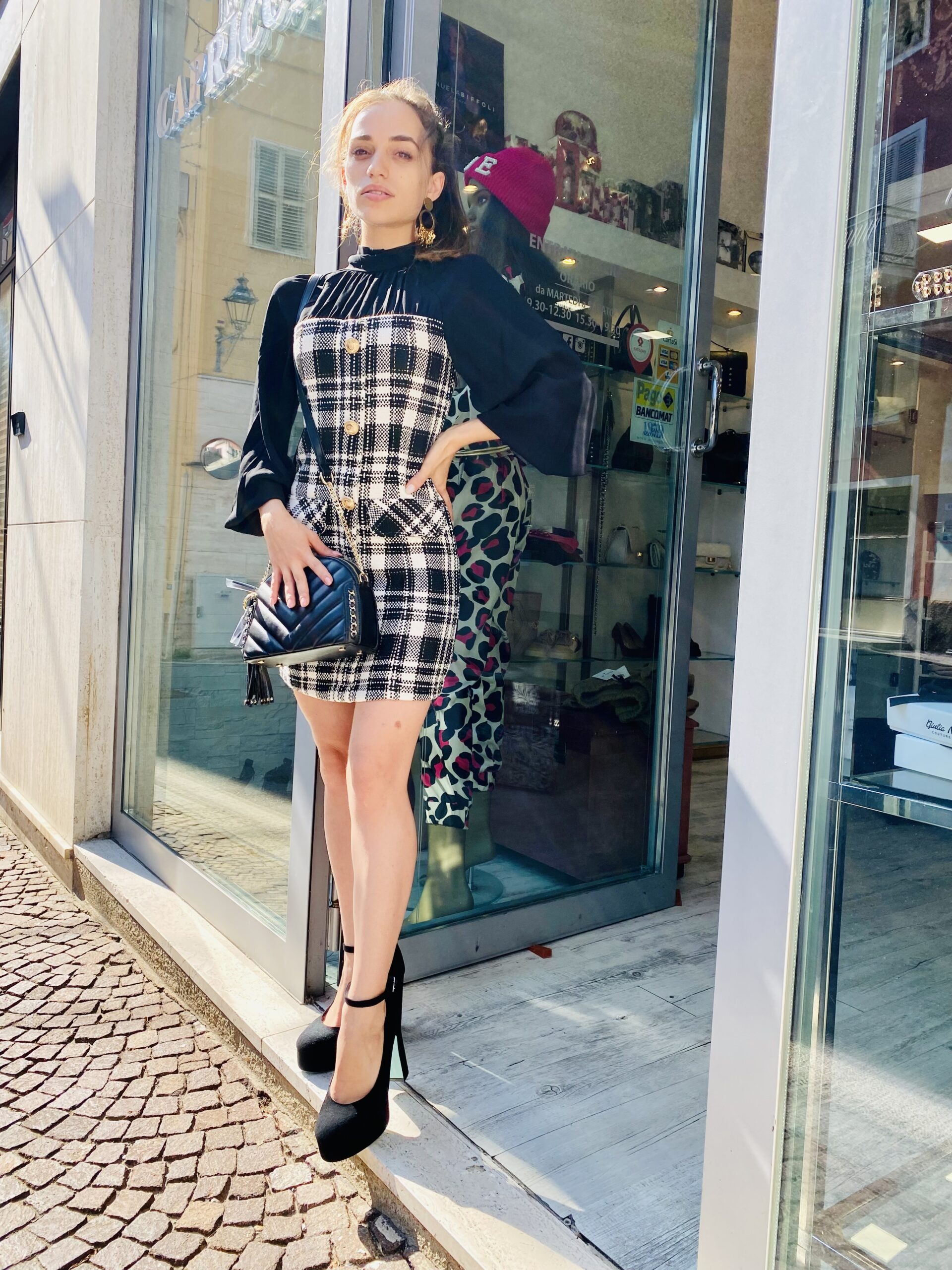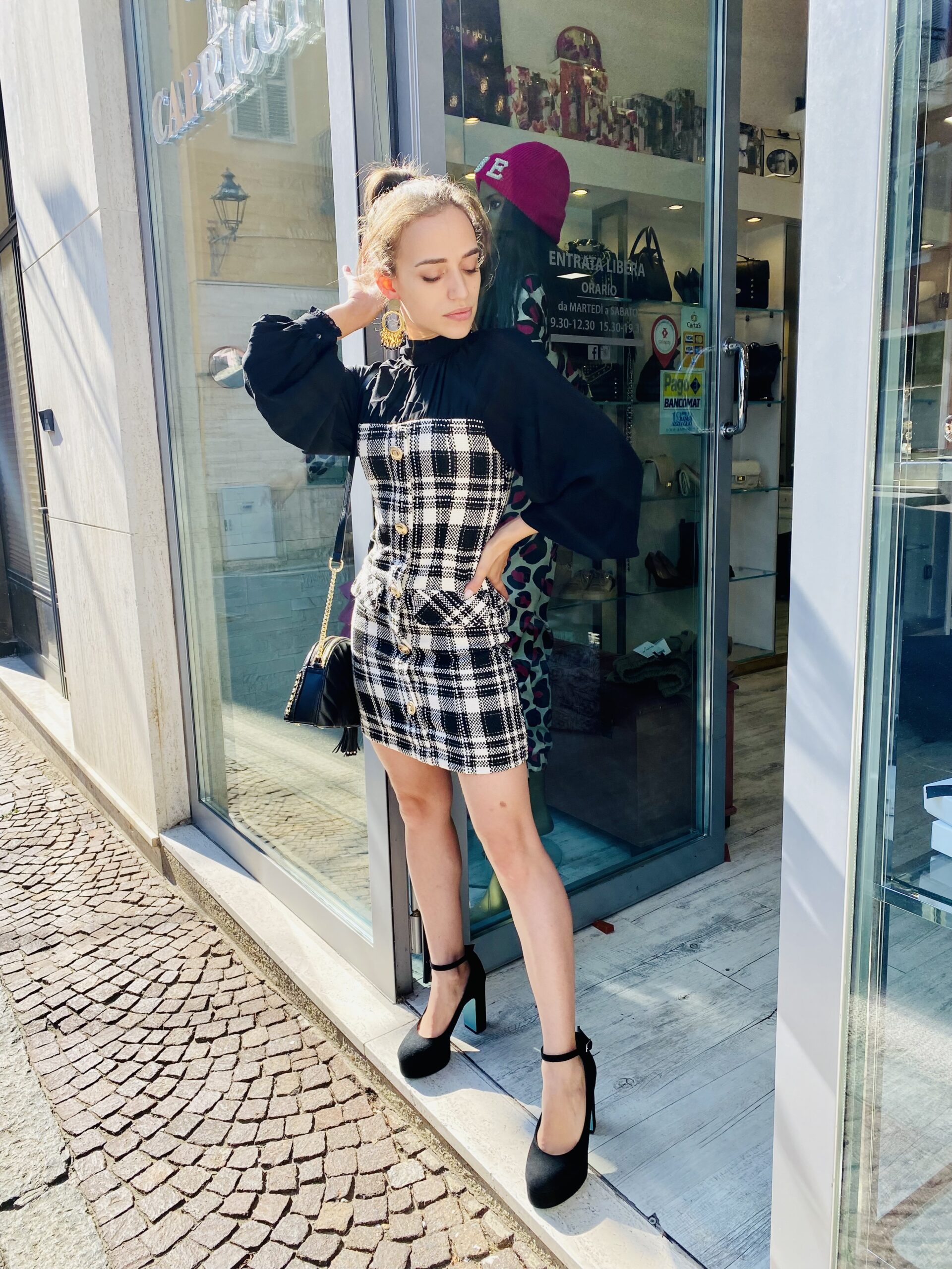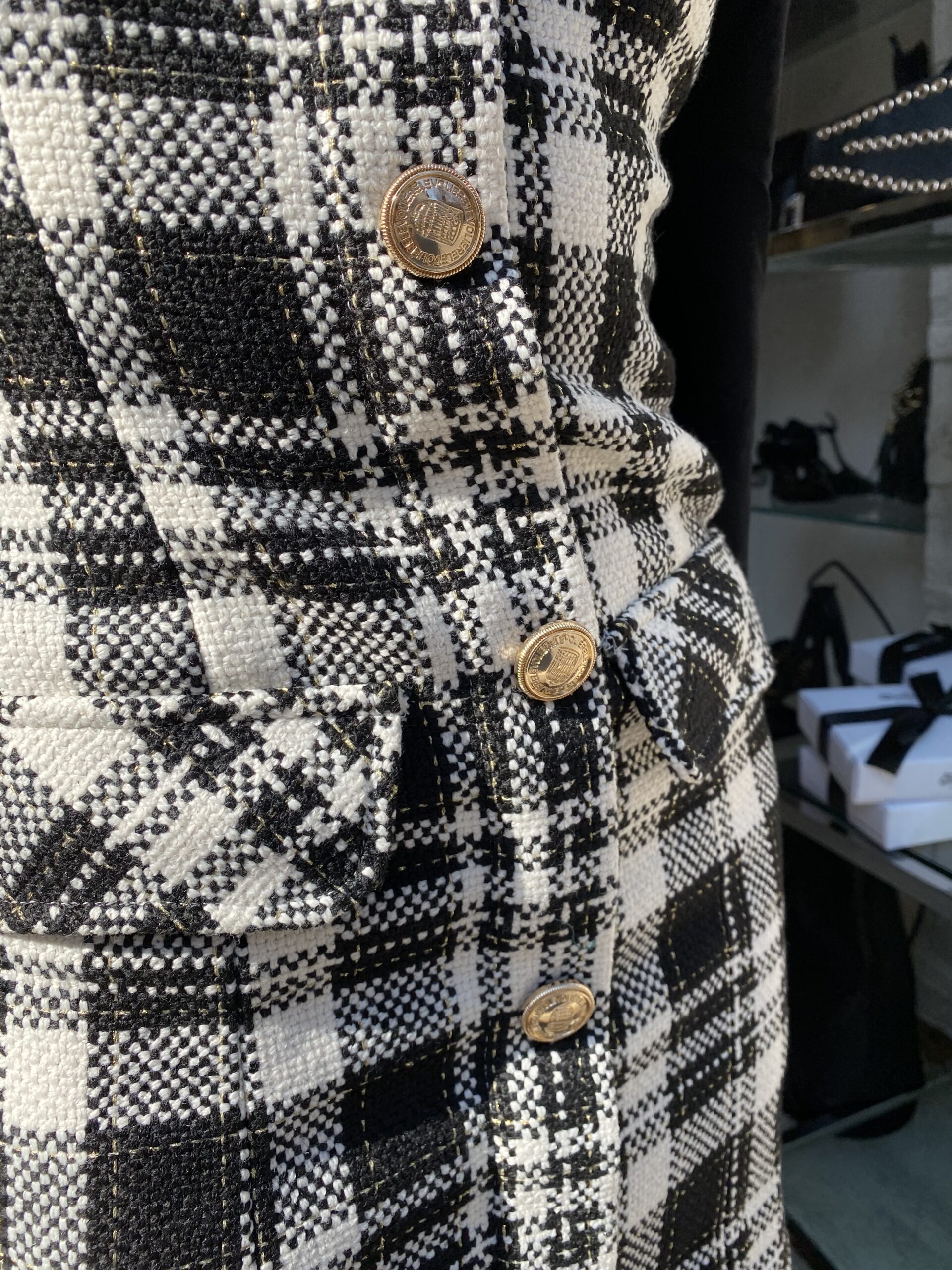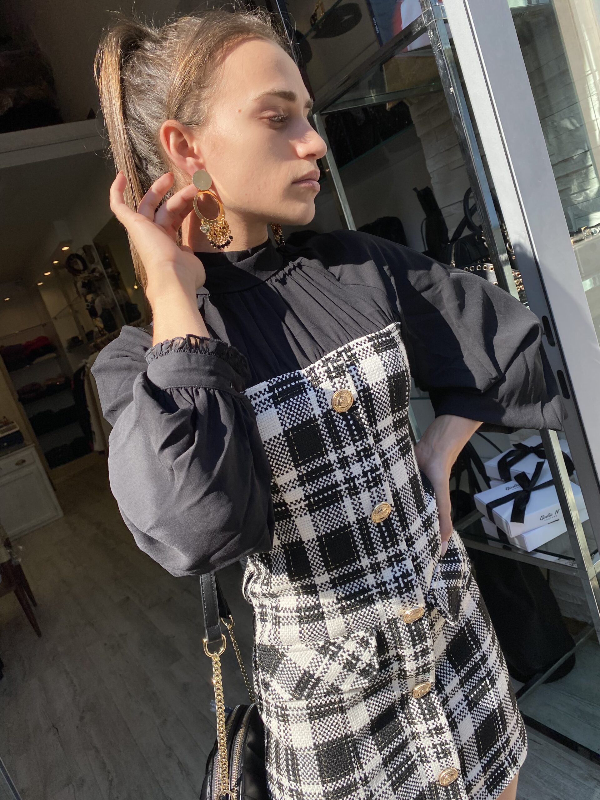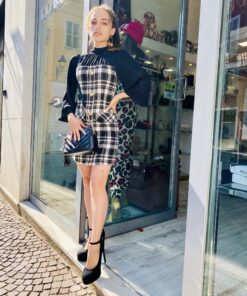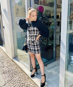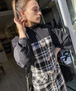 Vestito in tartan bianco e nero con bottoni logati oro e camicia nera