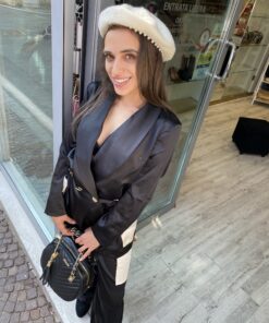Blazer satinato nero con tasche color avorio, coulisse in vita e bottoni logati oro