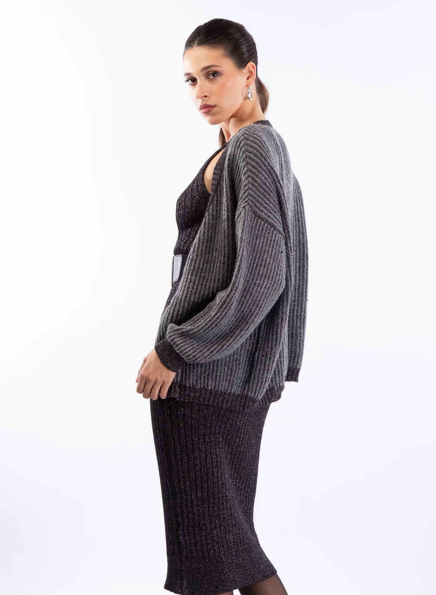 Cardigan in maglieria a costine grigio con lurex e bottoni logati argento