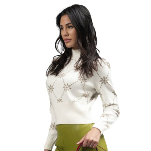 LUPETTO JACQUARD FIOCCO DI NEVE, COSTINA AL FONDO. MANICHE LUNGHE A SBUFFO ARRICCIATE AL FONDO CON POLSINO DI COSTINA. VESTIBILITA’ REGULAR. COMPOSIZIONE: 31% ACRILICO 23% POLIESTERE 23% NYLON 18% MODAL 5% LUREX