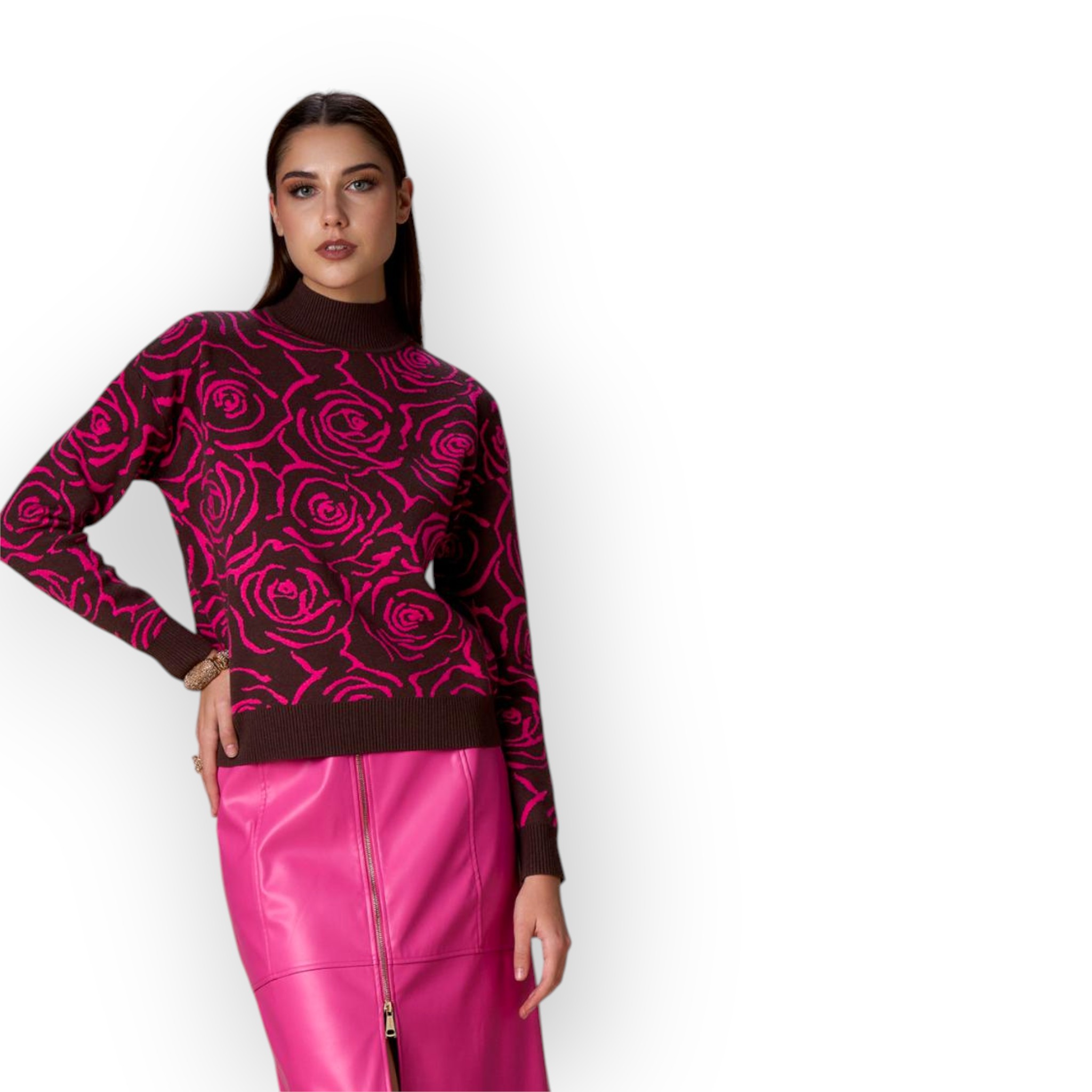 MAGLIA LUPETTO OVER CON SPALLA SCESA CIOCCOLATO CON FIORI FUCSIA
