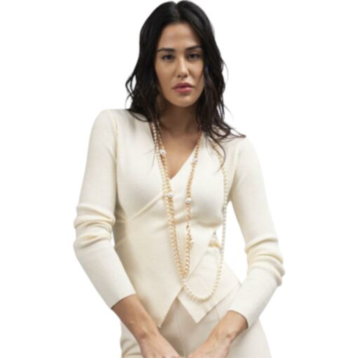 MAGLIA COSTINA SCOLLO A V INCROCIATA DAVENTI CON ORLO ASIMETTRICO. MANICHE LUNGHE STRETTE. VESTIBILITA’ SLIM. COMPOSIZIONE: 50% VISCOSA 28% ELASTAN 22% POLIAMMIDE
