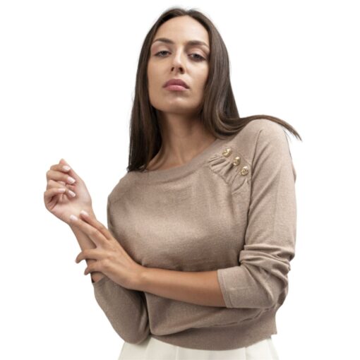 MAGLIA SCOLLO BARCA CON ARRICCIATURA ALLO SBACCIO SINISTRO, CON TRE BOTTONI. MANICHE RAGLAN LUNGHE DRITTE. COMPOSIZIONE: 40% VISCOSA 20% POLIAMMIDE 25% ELASTAN 15% LUREX