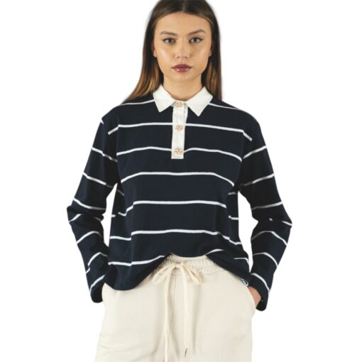 POLO A RIGHE BLU E PANNA , CON BOTTONI E COPRIBOTTONE GIOIELLO , VESTIBILITA’ OVER